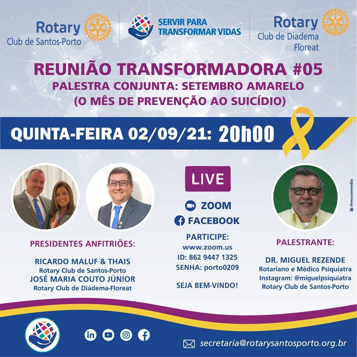 CONVITE - Na quinta-feira de 02 setembro de 2021, às 20h00, via plataforma Zoom e Facebook (@RotaryClubDeSantosPorto), realizaremos a 5ª Reunião Transformadora do Ano Rotário 2021-2022. Com o tema "SETEMBRO AMARELO - PREVENÇÃO DO SUICÍDIO", o médico psiquiatra Dr. Miguel Rezende, um dos principais especialistas do tema, será o palestrante da noite.