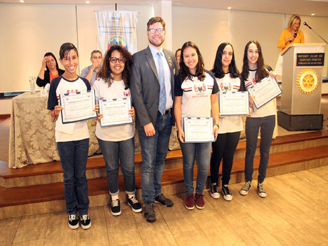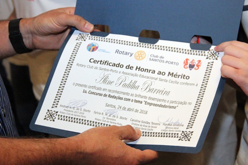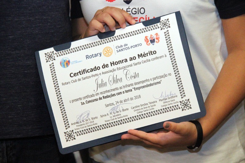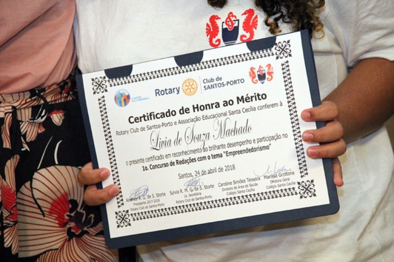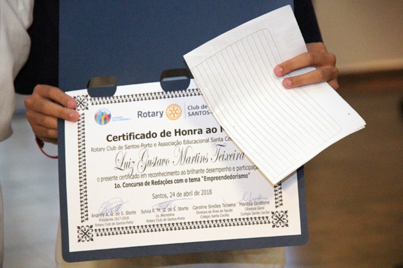 Após meses de trabalho, palestras e pesquisas com mais de 100 alunos, sobre o tema proposto do Empreendedorismo, foram selecionadas as cinco redações finalistas e seus respectivos autores. O evento de premiação ocorreu em 24 de abril, durante a reunião ordinária do clube, no Mendes Plaza Hotel, em Santos/SP. A cerimônia contou com a presença de professores, pais e convidados, além do corpo diretivo do Santa Cecília. Todos os finalistas foram reconhecidos com certificados de honra ao mérito. Os três primeiros colocados também foram laureados com medalhas de campeões. Andriey Storte, Presidente do Rotary Club de Santos-Porto, parabenizou os alunos do colégio e agradeceu o apoio de todos os envolvidos neste brilhante projeto educacional. O Rotary nas Escolas será um projeto permanente do Santos-Porto.