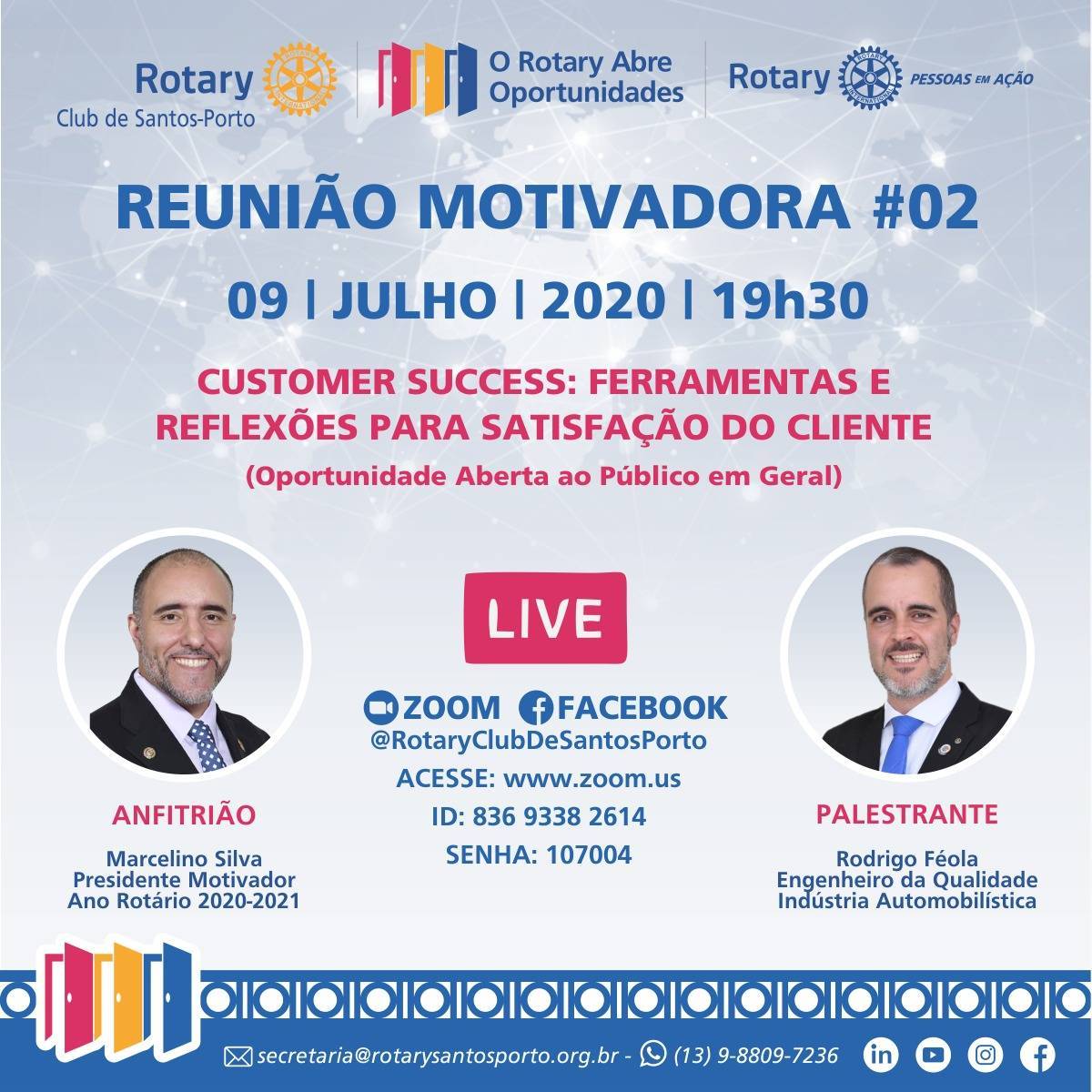 Nesta quinta-feira, às 19h30, por meio de live nas plataformas Facebook e Zoom Communications, o Rotary Club de Santo-Porto realiza a "2ª Reunião Motivadora" do Ano Rotário 2020-2021.
