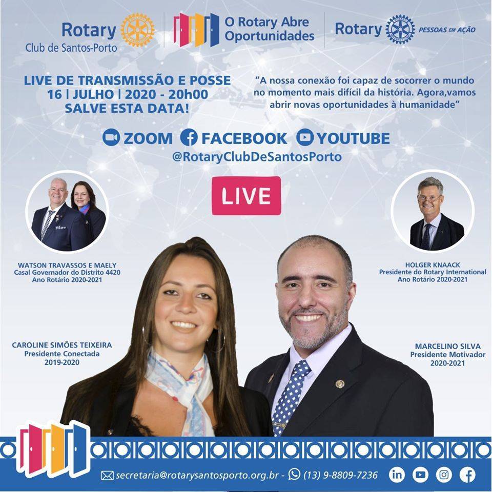 Caroline Simões Teixeira, Presidente Conectada 2019-2020; e Marcelino Silva, Presidente Motivador 2020-2021, representando todos os associados do Rotary Club de Santos-Porto, convidam para a solenidade online de Trasmissão e Posse do Conselho Diretor 2020-2021.